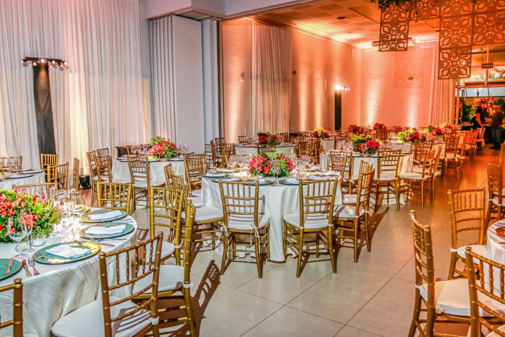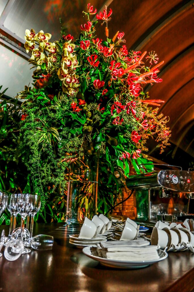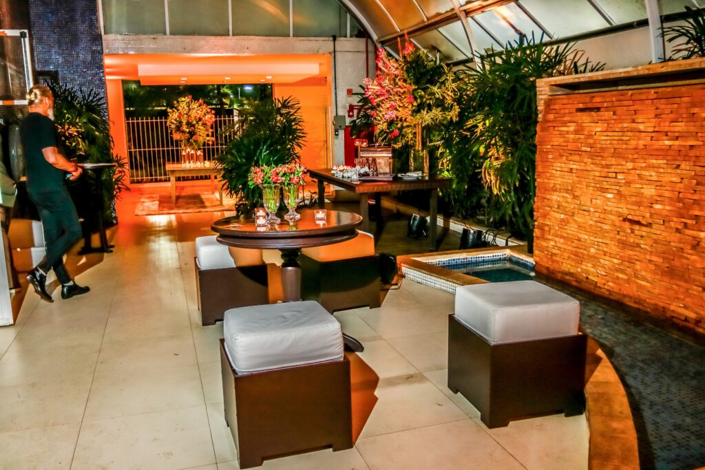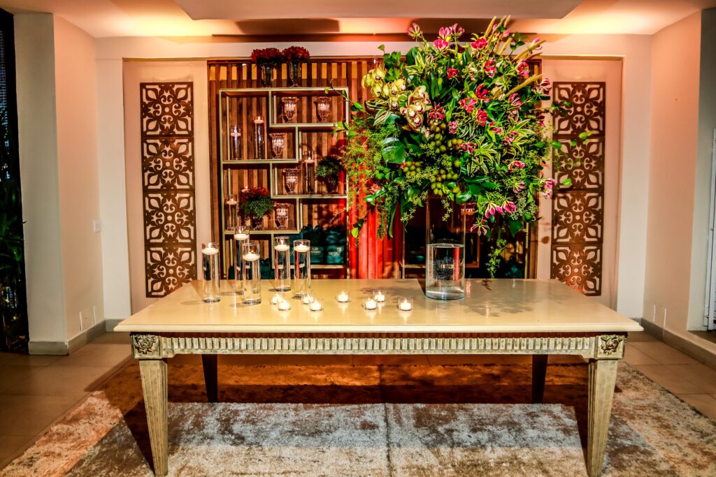 A decoração ímpar do salão foi desenvolvida por Pupy Zogaib, escolhida a dedo por ser a melhor especialista em cenografia, arte floral, esculturas em musgo, decoração e flores para eventos do Litoral.