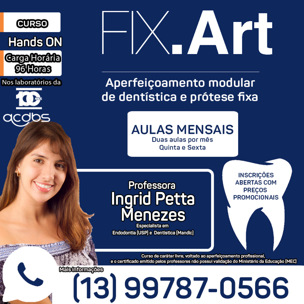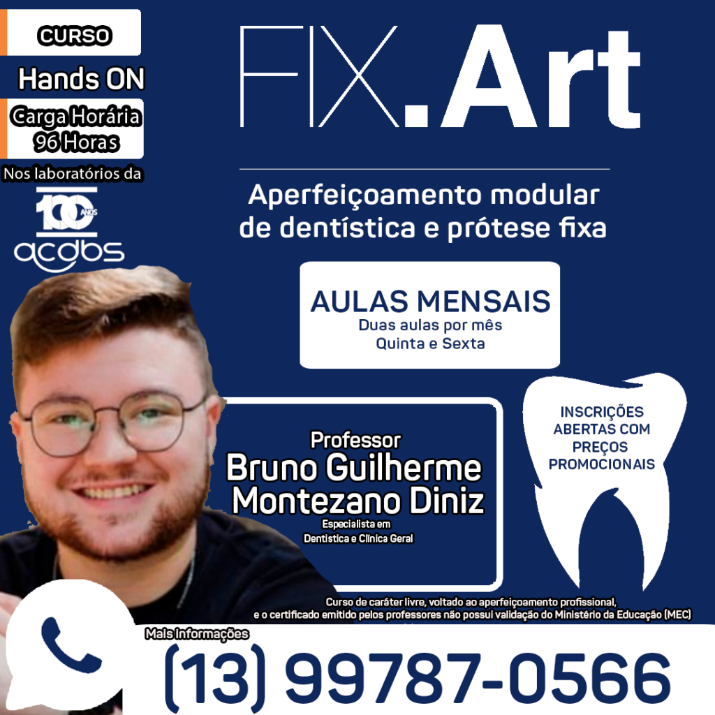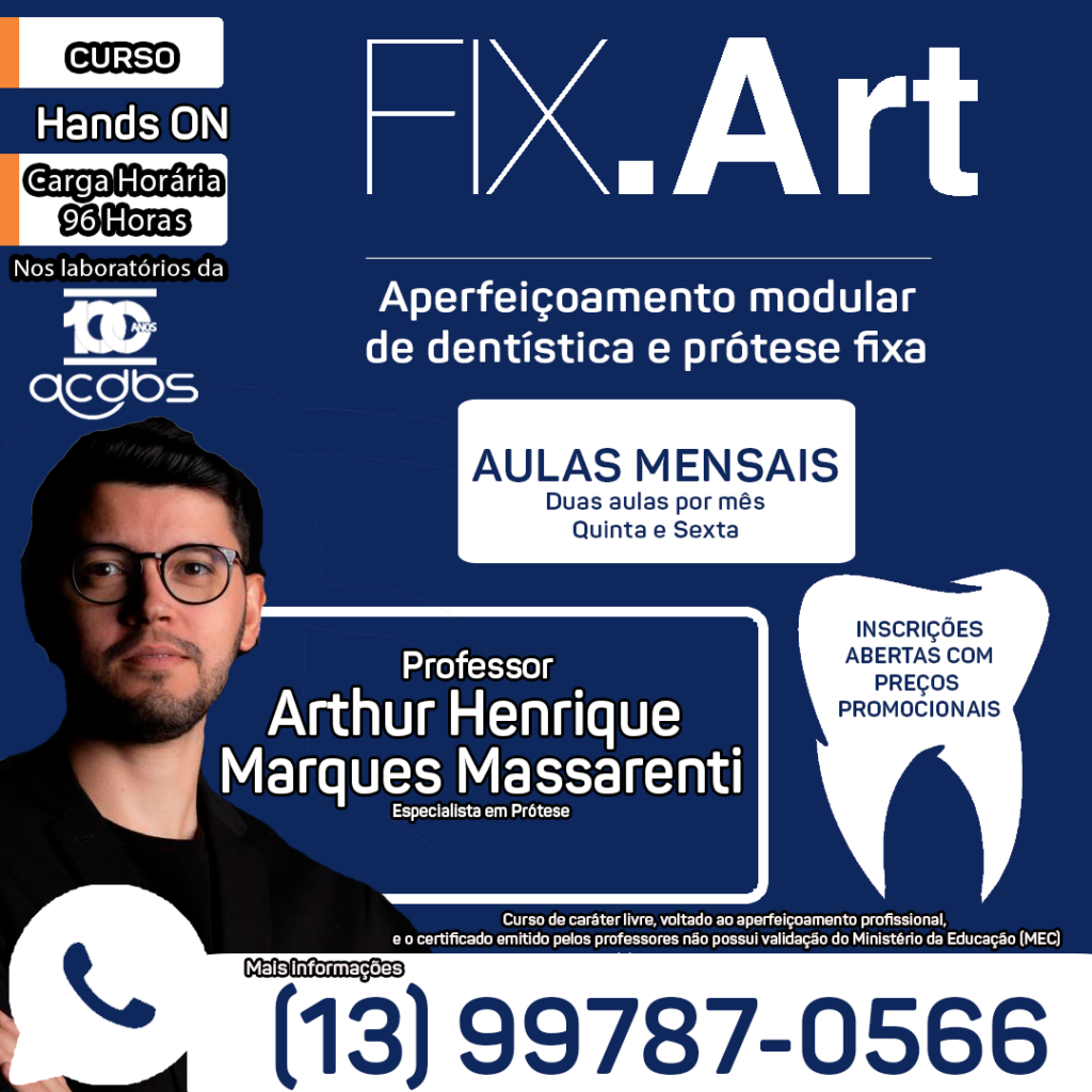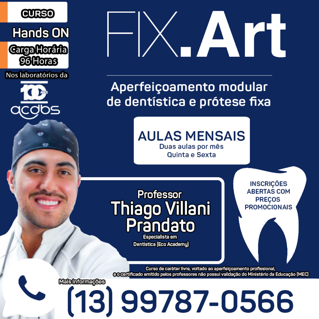 A sede da Associação dos Cirurgiões Dentistas da Baixada Santista (ACDBS) receberá, entre fevereiro e junho de 2026, a segunda turma do curso FIX.Art – Aperfeiçoamento Modular de Dentística e Prótese Fixa. A iniciativa é uma promoção dos professores Cirurgiões Dentistas Dr. João Vitor Julião do Carmo e Dr. Arthur Henrique Marques Massarenti, e oferece aos Cirurgiões Dentistas a oportunidade de aprofundar conhecimentos em reabilitação oral estética e funcional. Além dos dois professores, também dão aulas no curso mais três Cirurgiões Dentistas: Dr. Bruno Guilherme Montezano Diniz, Dra. Ingrid Petta Menezes e Dr. Thiago Villani Prandato. As aulas começam em 19 de Fevereiro e restam poucas vagas.