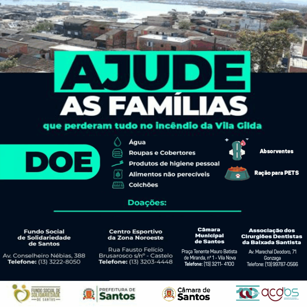 Sempre preocupada em servir a sociedade, a Associação dos Cirurgiões Dentistas da Baixada Santista (ACDBS) está recebendo em sua Sede (Av. Marechal Deodoro, 71, no Gonzaga, em Santos) doações de  água, roupas e cobertos, produtos de higiene pessoal, alimentos não perecíveis e colchões que serão encaminhados ao Fundo Social de Solidariedade de Santos (Av. Conselheiro Nébias, 388 – telefone 3222-8050), local de concentração das doações para atender as mais de 100 famílias atingidas no incêndio do Caminho São Sebastião, no Dique da Vila Gilda, nesta sexta-feira (01/08). As doações podem ser feitas no horário de funcionamento da ACDBS.