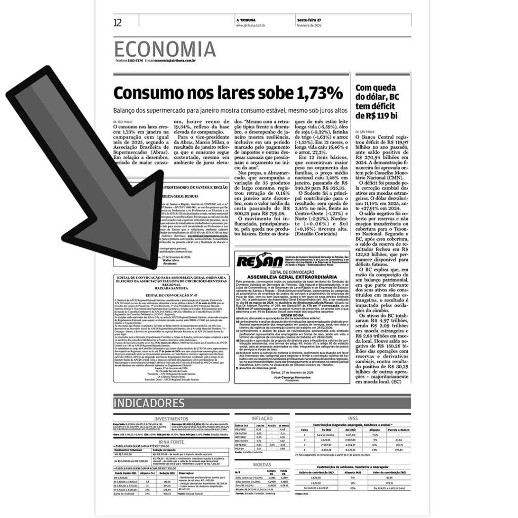Confira Edital publicado no Jornal A Tribuna na página 12 desta sexta (27/02/2026)