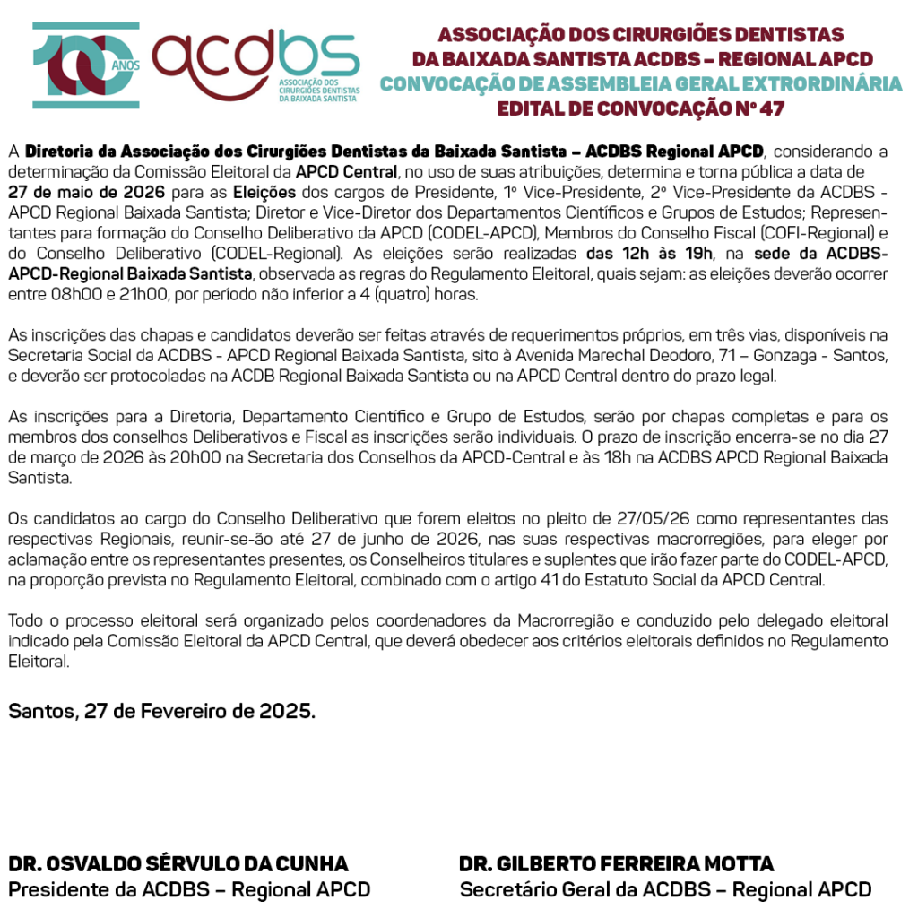 A Associação dos Cirurgiões Dentistas da Baixada Santista - Regional Associação Paulista dos Cirurgiões Dentistas na Baixada Santista realizará eleições para Diretoria, departamentos e conselhos em 27 de maio de 2026, com inscrições de chapas e candidatos abertas até 27 de março de 2026, conforme edital publicado pela Entidade no Jornal A Tribuna desta sexta (27/02/2026) e no site da Entidade .